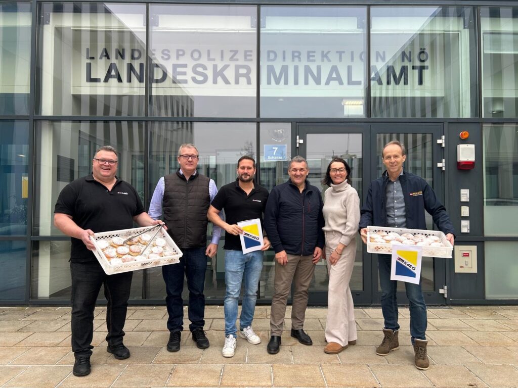 Gestern, am Rosenmontag, überbrachte Katja Seitner, Landesgeschäftsführerin des Niederösterreichischen Arbeitnehmerinnen- und Arbeitnehmerbundes (NÖAAB) gemeinsam mit den Vertretern der FCG-KdEÖ Hannes Luef und Christian Grümeyer Faschingskrapfen an die Beamtinnen und Beamten des Landeskriminalamtes in St. Pölten.